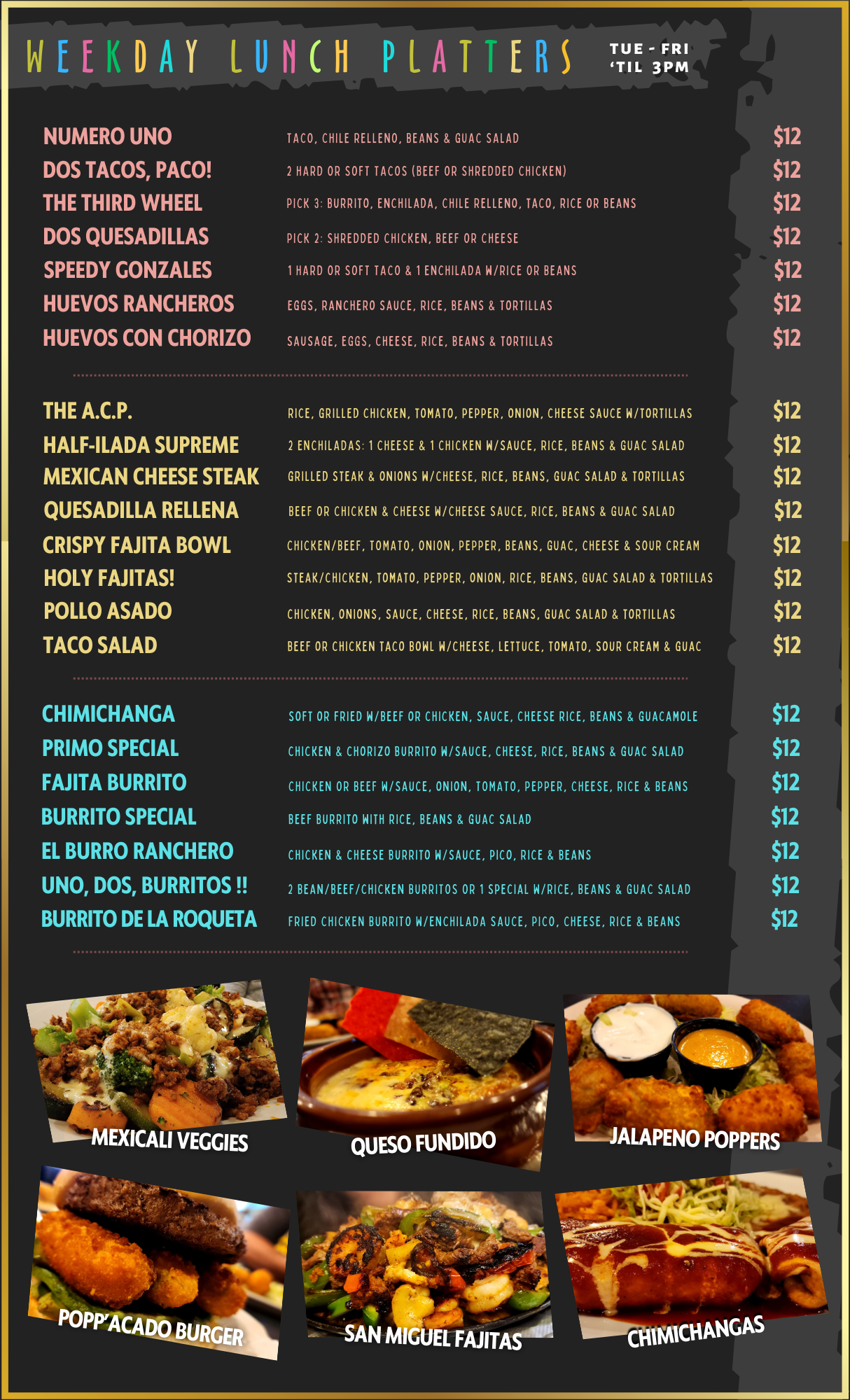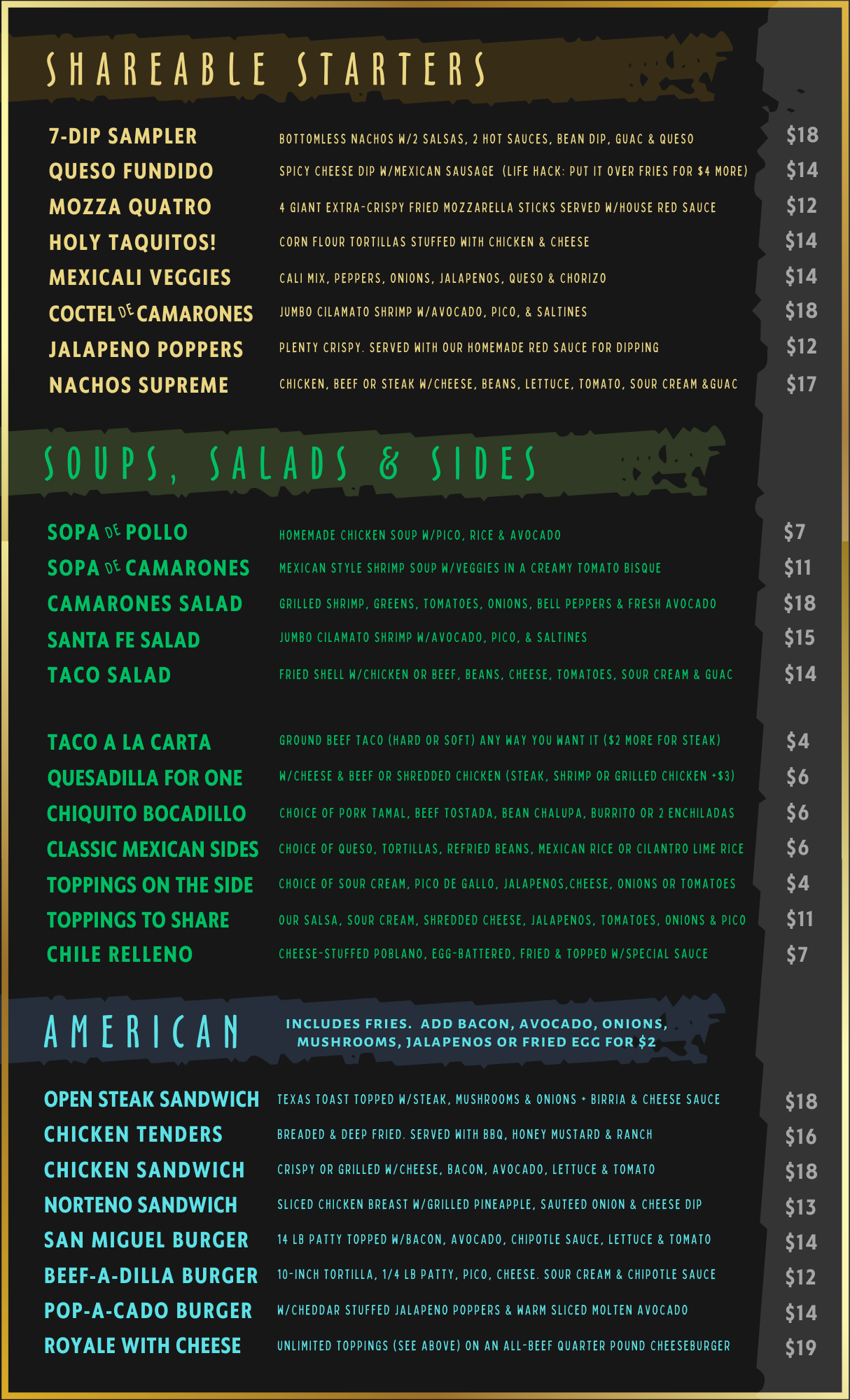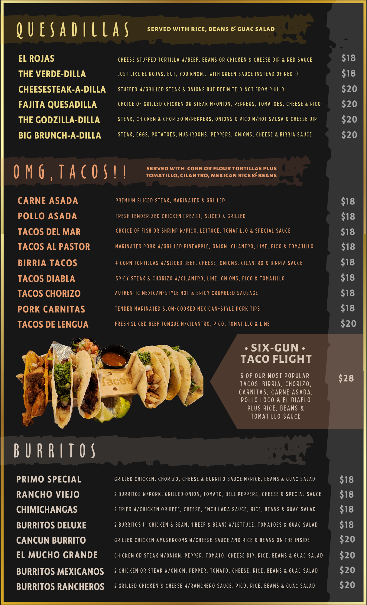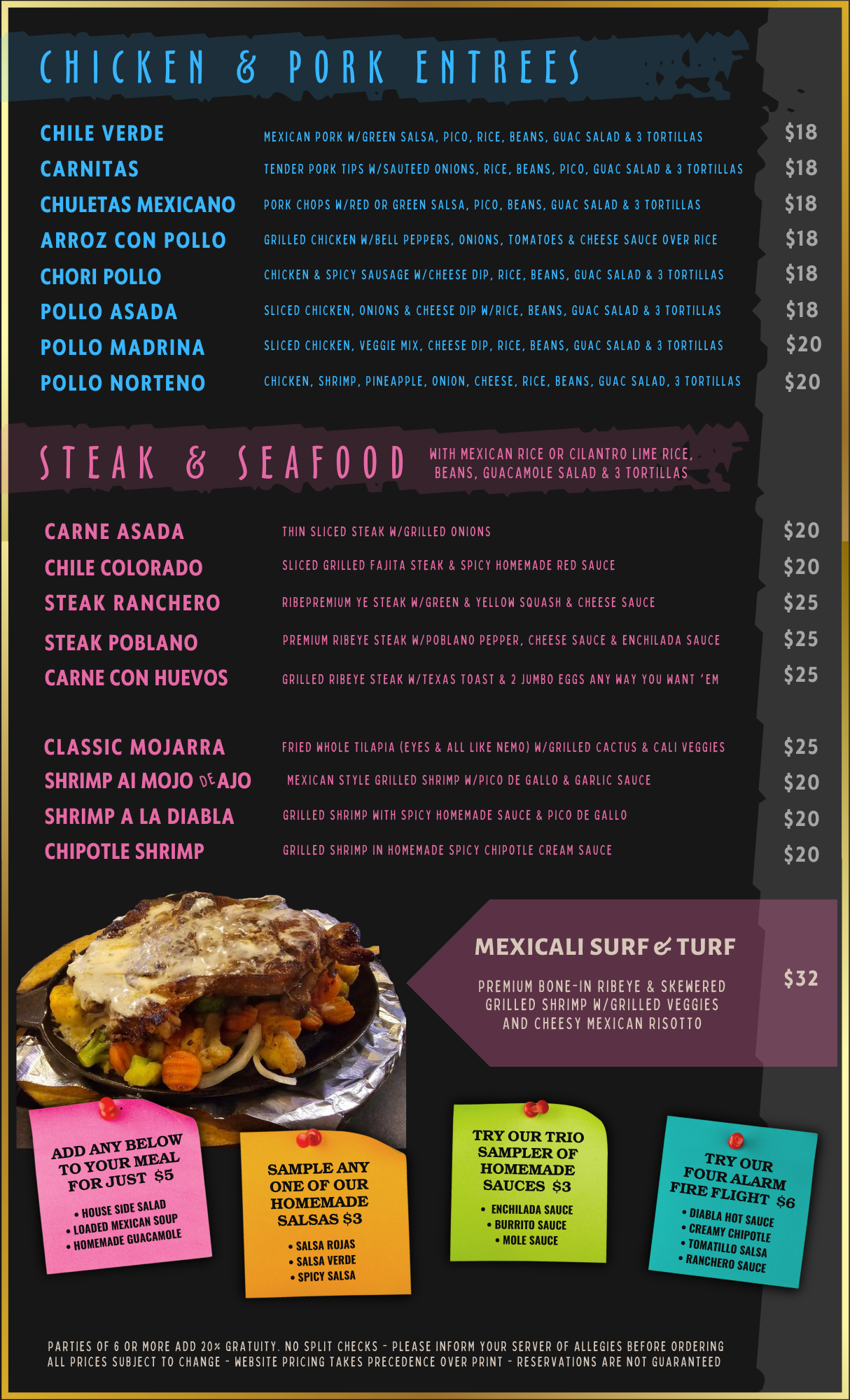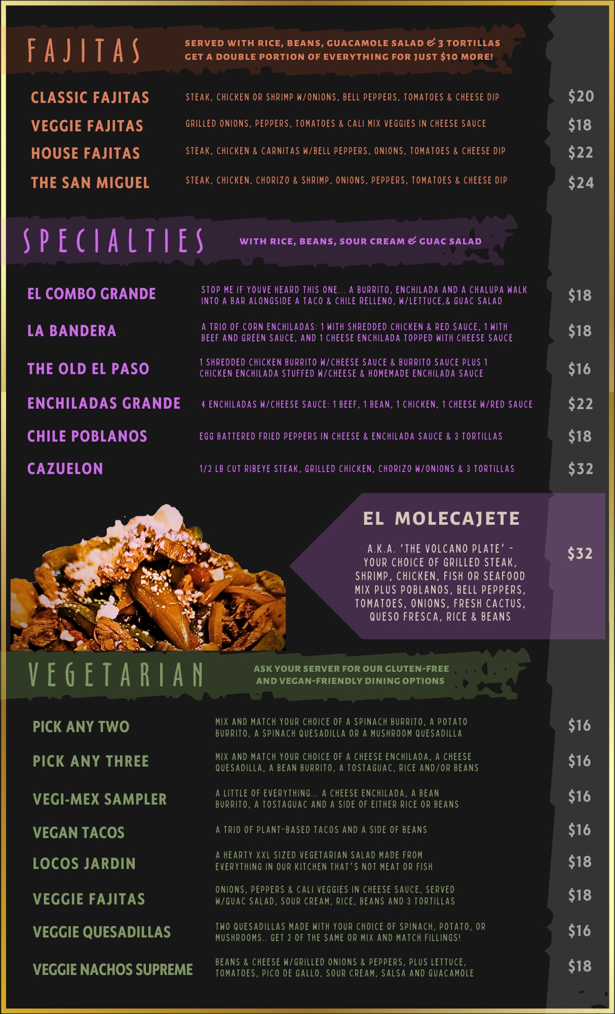 Our menu features a variety of traditional Mexican dishes, made with fresh ingredients and bold flavors. Whether you're craving sizzling fajitas, cheesy enchiladas, or our signature salsa or guacamole, there's something for everyone to enjoy!